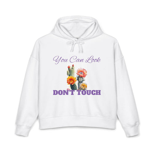 Lightweight warmth with a conscious heart. This mid-weight organic hoodie drapes with a relaxed, dropped-shoulder silhouette and a double-layered hood that feels both cozy and refined. The watercolor cactus and bloom artwork paired with text reading "You can look, DON'T TOUCH flow perfectly together to make a pretty and blunt statement. Built to last with double-needle seams, embroidered eyelets, and a reinforced half-moon at the neck, it settles into your wardrobe and only gets better. Wear it on slow mornings with coffee, road trips down sunlit highways, or evenings around a backyard fire — it fits into days when comfort and care matter.